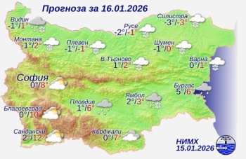 Днес вятърът в цялата страна ще се ориентира от североизток, ще се усили и с него ще нахлува студен въздух. Ще преобладава облачно време и на места ще има слаби валежи от сняг. Отначало в Източна България валежите ще са от дъжд, но със застудяването ще преминат в сняг. В североизточните райони преди обяд ще има условия за поледици. От дъжд ще са валежите през по-голямата част от деня в Горнотракийската низина и по Южното Черноморие, но и там вечерта ще се примесват със сняг. Почти без валежи и с повече слънчеви часове ще се задържи времето в югозападните райони. Температурите ще се понижават и към 14 ч. ще са от минус 3° - минус 2° в североизточните до 8°-10° в крайните югозападни райони, в София – около 8°.