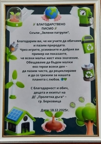 Младежката инициатива на Община Берковица „Зелен патрул“ получи благодарствено писмо от децата и екипа на ДГ „Пролетна дъга“ в знак на признание за активната им работа и приноса им в сферата на екологичното образование и възпитание на най-малките.