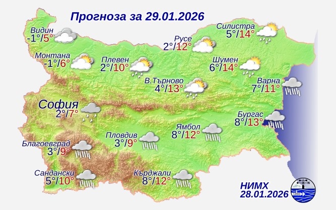 Днес времето в страната ще е под влияние на средиземноморски циклон. Ще бъде предимно облачно, на места в равнините и мъгливо. След временно отслабване и спиране на валежите, още преди обяд от юг отново ще се активизират и до вечерта ще обхванат почти цялата страна. Значителни количества на валежите ще има в Южна България. В югоизточните райони са възможни и гръмотевици. В Северозападна България ще е почти без валежи. Вятърът ще отслабне и за кратко ще се ориентира от юг-югоизток, а след обяд – от север-североизток и привечер в Североизточна България ще се усили. Максималните температури ще са предимно между 7° и 12°, малко по-високи в Източна България, в София – около 7°.