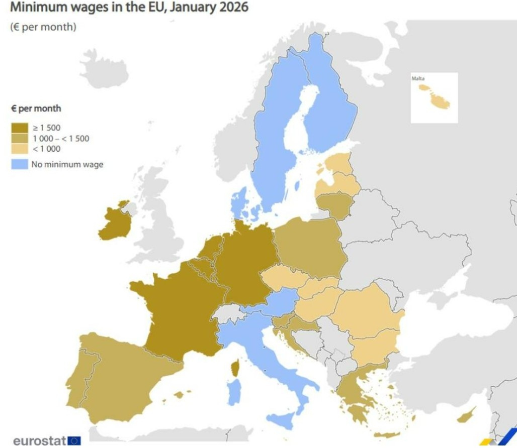 Според данни на Евростат към 1 януари 2026 г. 22 от 27 държави в ЕС имат национална минимална работна заплата. Изключение правят Дания, Италия, Австрия, Финландия и Швеция.
