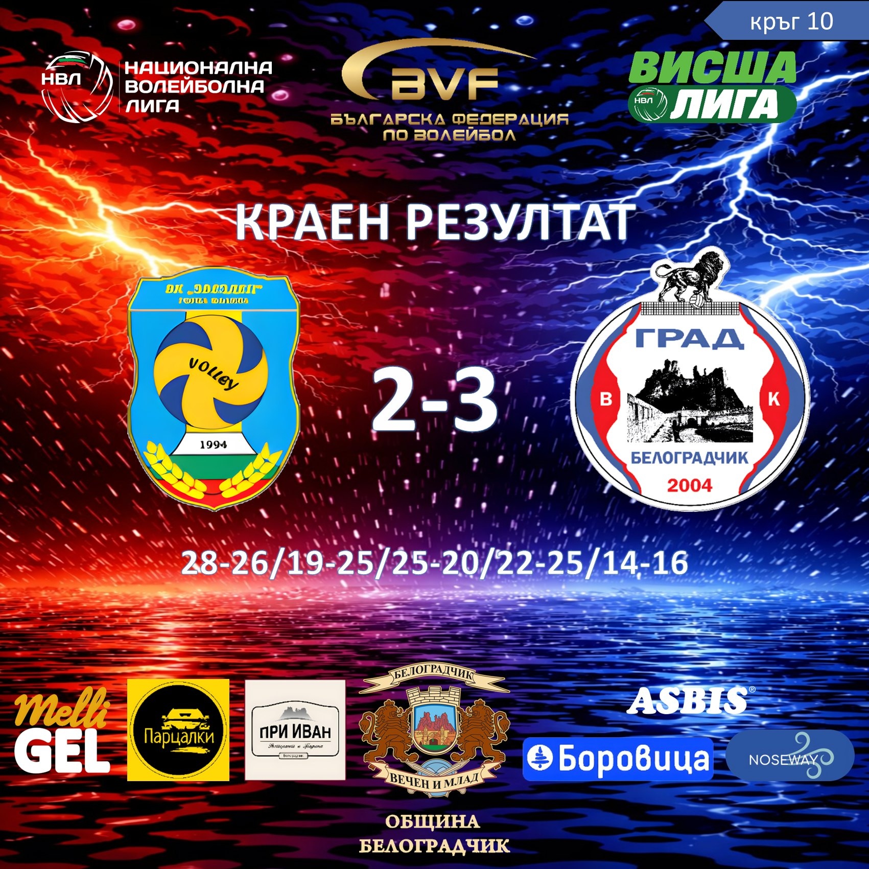 В последната среща от 10 кръг на НВЛ Висша лига момчетата на "Град" Белоградчик надделяха с 3-2 гейма срещу домакините от Звездец (Горна Малина), нанасяйки им първо домакинско поражение за сезона. С този успех отбора прекъсна негативната си серия от три поредни загуби.