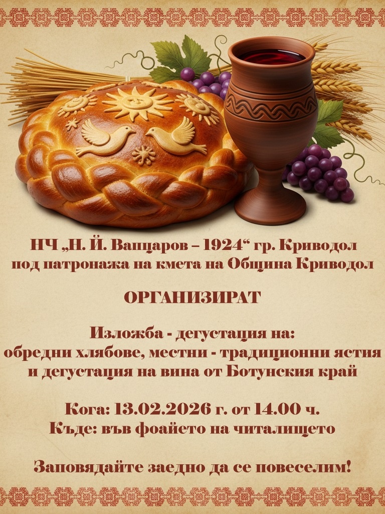 Под патронажа на кмета на Община Криводол г-н Христо Доков,читалище ,,Никола Й.Вапцаров-1924 '' - Криводол има удоволствието да Ви покани на тържествено честване на празника Трифон Зарезан, посветен на лозарите, винарите и българската традиция!