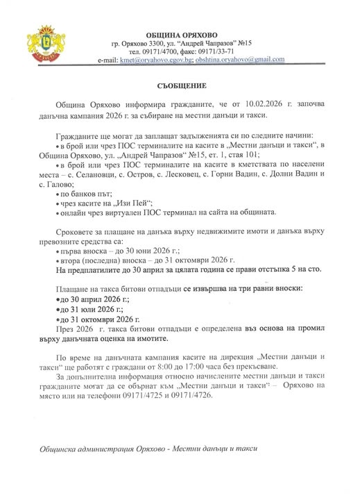 Община Оряхово информира гражданите, че от 10 февруари 2026 г. започва данъчна кампания 2026 г. за събиране на местни данъци и такси.