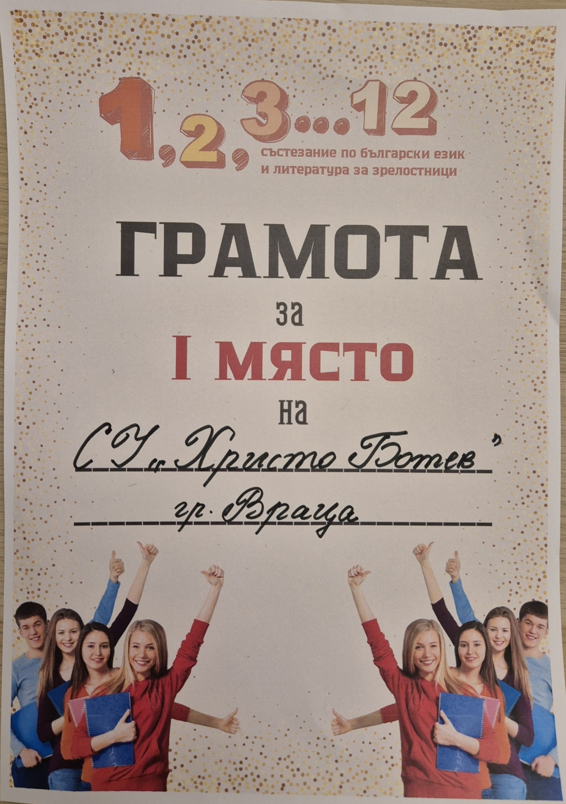 В спор с още шест отбора от най-добрите врачански училища екипът на 12.А клас спечели 1. място в състезанието по БЕЛ за зрелостници „1,2,3…12“, организирано от Регионалното управление на образованието – Враца. Отборът „Бяла врана“ водеше еднолично от първия до последния кръг. Впечатляващ е постигнатият резултат, който е с една точка под максимално възможния! Отборът в състав Анелия Цветанова, Валентина Николова, Гергана Богданова, Никол Конова и Цветина Ангелова не успя да отговори правилно само на един от поставените въпроси.