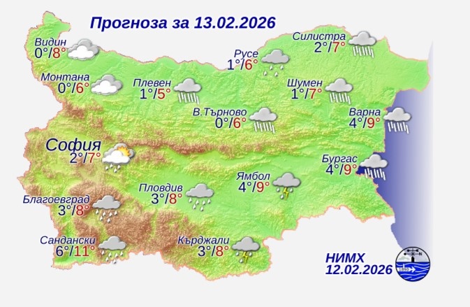 Валежите през деня ще обхванат по-голямата част от страната. Значителни по количество ще бъдат те на много места в южните райони. В югоизточните части от страната ще има и гръмотевична дейност. Ще духа до умерен, в източните райони временно силен вятър от север-североизток, в Дунавската равнина – от запад. В повечето места минималните температури ще бъдат между 0° и 5°, за София – около 2°, максималните – между 5° и 10°, за София – около 7°.
