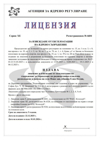 Агенцията за ядрено регулиране издаде на Държавно предприятие „Радиоактивни отпадъци“ първата електронна лицензия за извеждане от експлоатация в страната. Документът е в сила от 1 януари 2026 г. за срок от пет години и определя изискванията за безопасност при извеждане от експлоатация на Постоянното хранилище за радиоактивни отпадъци край с. Нови хан, община Елин Пелин.