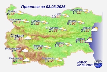 Днес преди обяд облачността ще е значителна, средна и висока. След обяд ще се разкъсва и намалява до предимно слънчево време. Ще духа слаб вятър от северната четвърт. След обяд в Източна България вятърът временно ще се ориентира от север-североизток и с него ще прониква по-студен въздух. Максималните температури ще са от 10° – 12° в Лудогорието до 15° – 17° на места в Югозападна България; в София 13°.