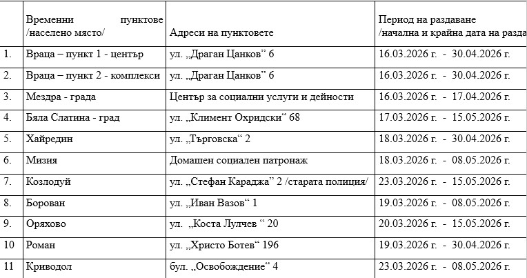Раздаването ще се извършва от служители и доброволци на БЧК Враца в 11 временни пункта в цялата област и ще продължи до 15.05.2026 г. Всеки правоимащ гражданин ще получава полагащите му се продукти срещу документ за самоличност и подпис.