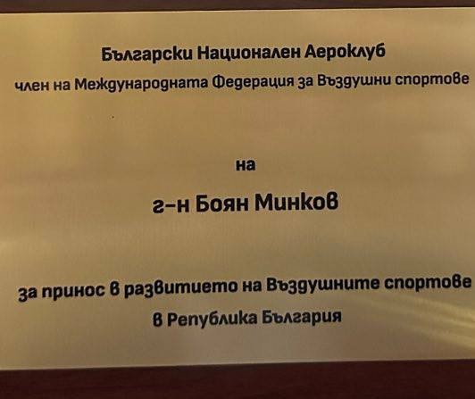 "Този път призът ни бе връчен от Българския Национален Аероклуб. За принос в развитието на въздушните спортове в България, като съорганизатори на Балонената фиеста, превърнала се в една от емблемите на Белоградчик!", написа Боян Минков.