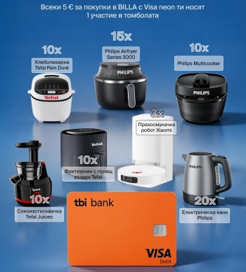 Новите клиенти, които активират своята карта Visa neon в супер приложението на tbi bank и направят покупка в BILLA на стойност поне 25 евро, ще получат еднократен кешбек от 10 евро директно в разплащателната сметка към картата. В същото време всички притежатели на Visa neon – нови и досегашни, които пазаруват в магазините на BILLA по време на кампанията, автоматично участват в седмични томболи за разнообразни домакински уреди, включително прахосмукачки-роботи, уреди за здравословно готвене (air fryer, multicooker), хлебопекарни и много други.