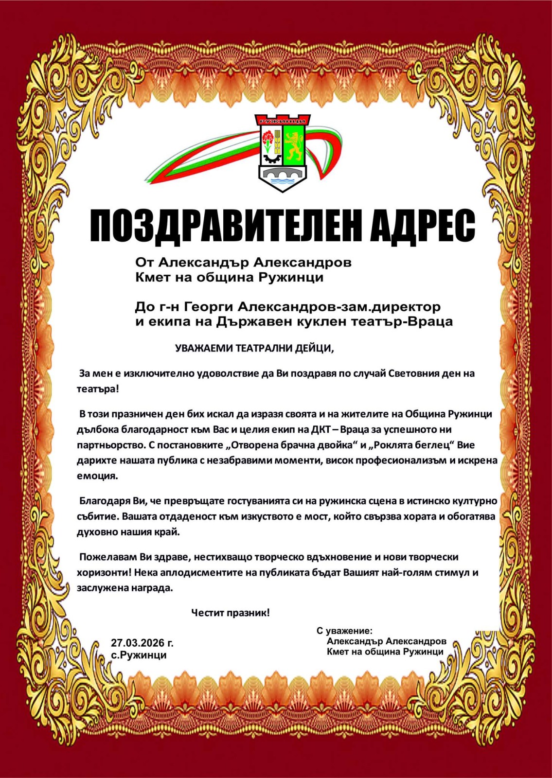 В края на вечерта кметът на община Ружинци, г-н Александър Александров, излезе на сцената, за да поздрави лично актьорите и творческия екип. Той благодари на жителите и гостите за присъствието и интереса към изкуството, подчертавайки, че общината ще продължи да подкрепя подобни качествени културни събития.