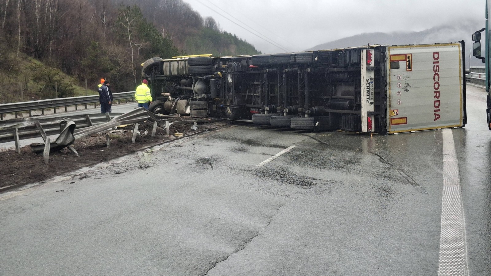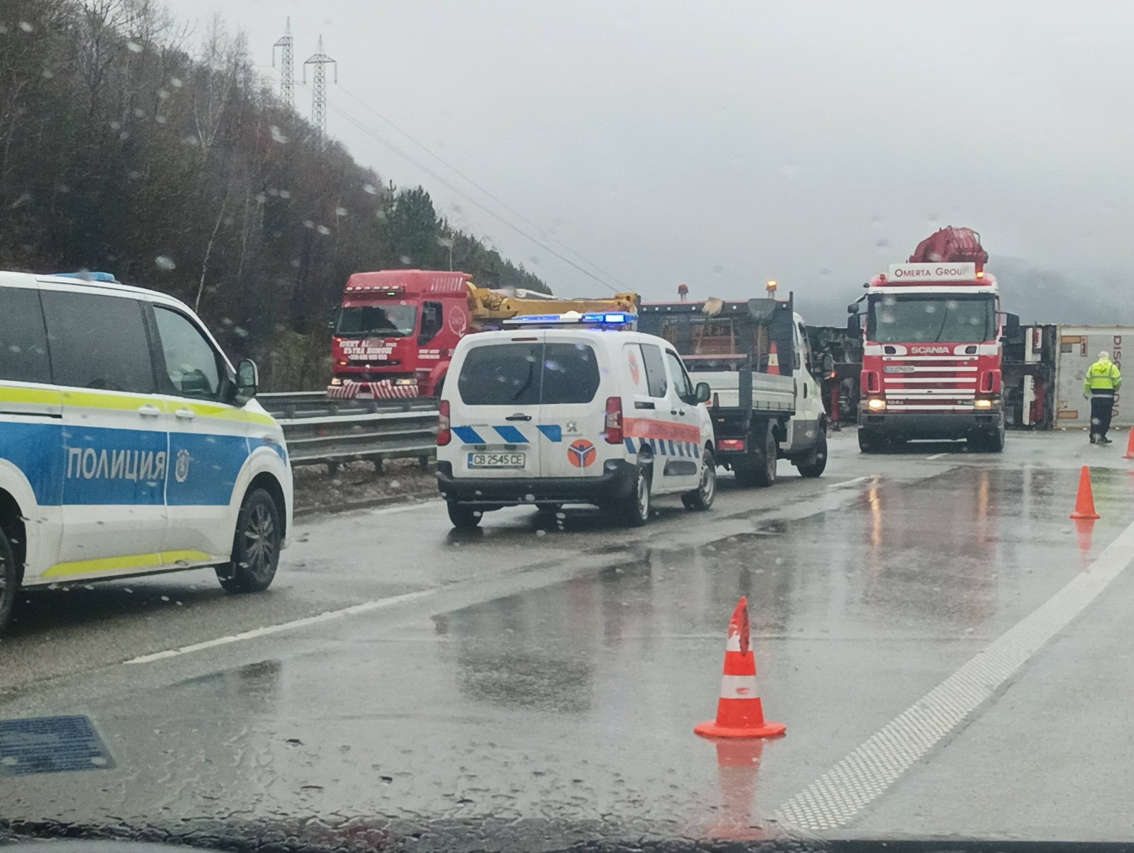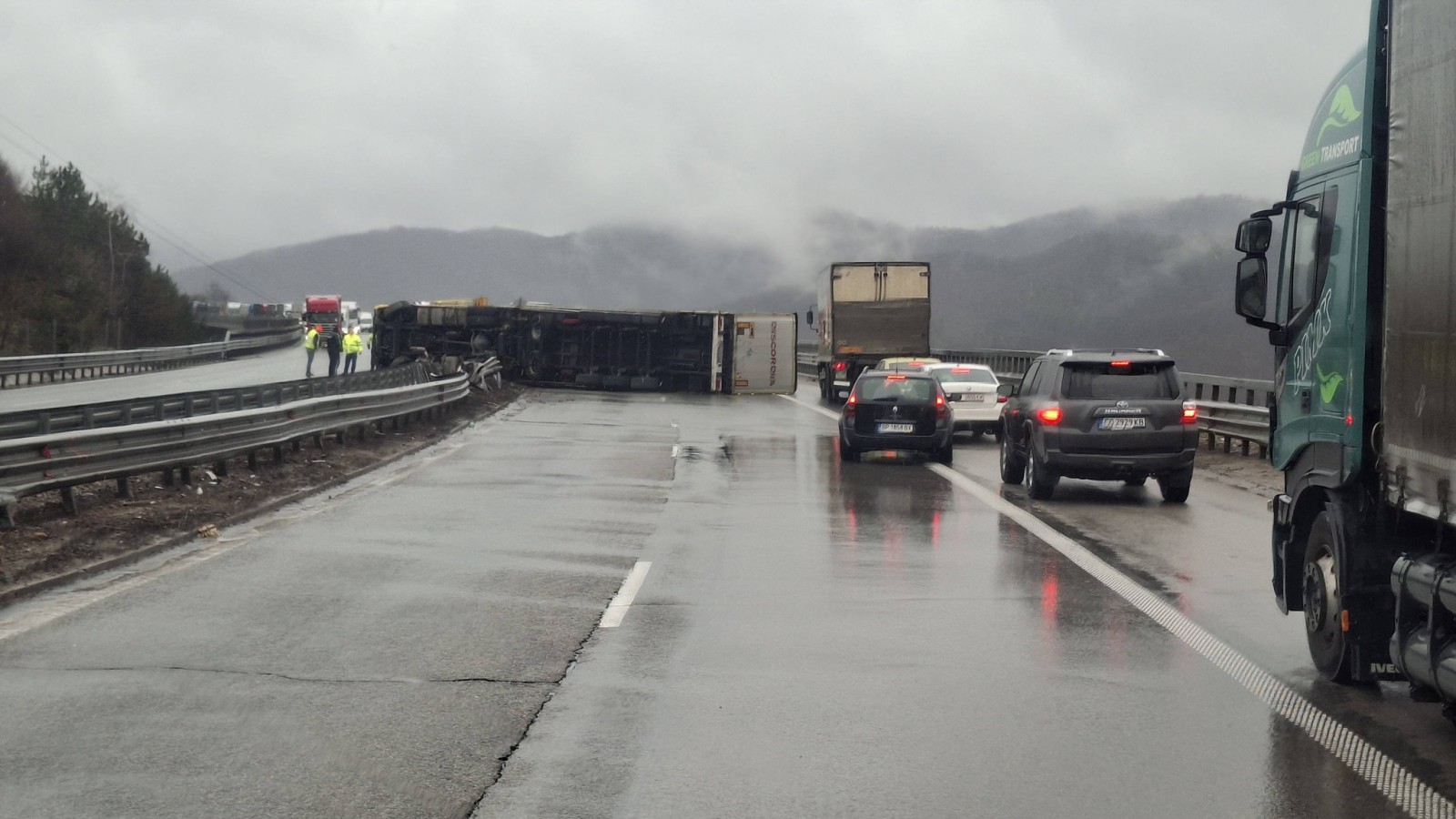 ТИР се е преобърнал на автомагистрала „Хемус“ след втория тунел. Тежкият камион е пътувал от София в посока Ботевград. При инцидента са затапени и двете ленти за движение. Преминаването е възможно само в аварийната лента. Вече са се образували опашки от чакащи автомобили. До изтеглянето на обърнатия камион шофьорите могат да изберат трасето през дефилето.