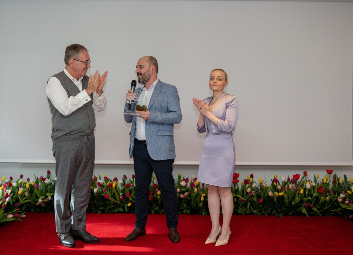 Основателят на Българския Кардиологичен Институт и първи Председател на Съвета на директорите, г-н Тихомир Каменов връчва наградата на д-р Горан Сарафилоски под аплодисментите на административния директор д-р Ембие Азис.