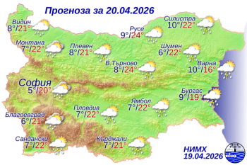 Днес през страната ще премине атмосферно смущение. Денят ще започне с предимно слънчево време, но още преди обяд от запад на изток ще се развива купеста и купесто-дъждовна облачност. Около и след обяд на места ще има краткотрайни валежи, придружени с гръмотевици. Възможни са и градушки. Вятърът ще е слаб до умерен, преди обяд от юг-югозапад, около обяд ще се ориентира от северозапад и ще се усили, най-късно в Източна България. Максималните температури ще бъдат между 19° и 24°, по Черноморието - между 15° и 19°, в София – около 20°.
