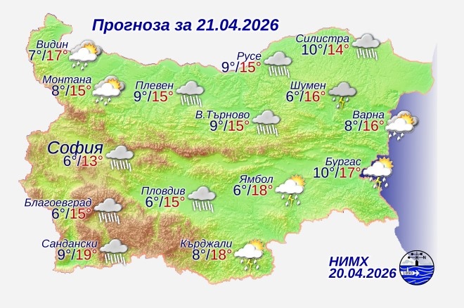 Днес още преди обяд облачността от северозапад ще се увеличи и ще обхване цялата страна. Ще има валежи, интензивни и значителни на много места в Южна България. Ще има гръмотевици. Вятърът ще се ориентира от северозапад, в Източна България от север-североизток, ще бъде слаб и умерен и с него ще прониква студен въздух. Максималните температури ще бъдат между 13° и 18°, в София – около 13°.