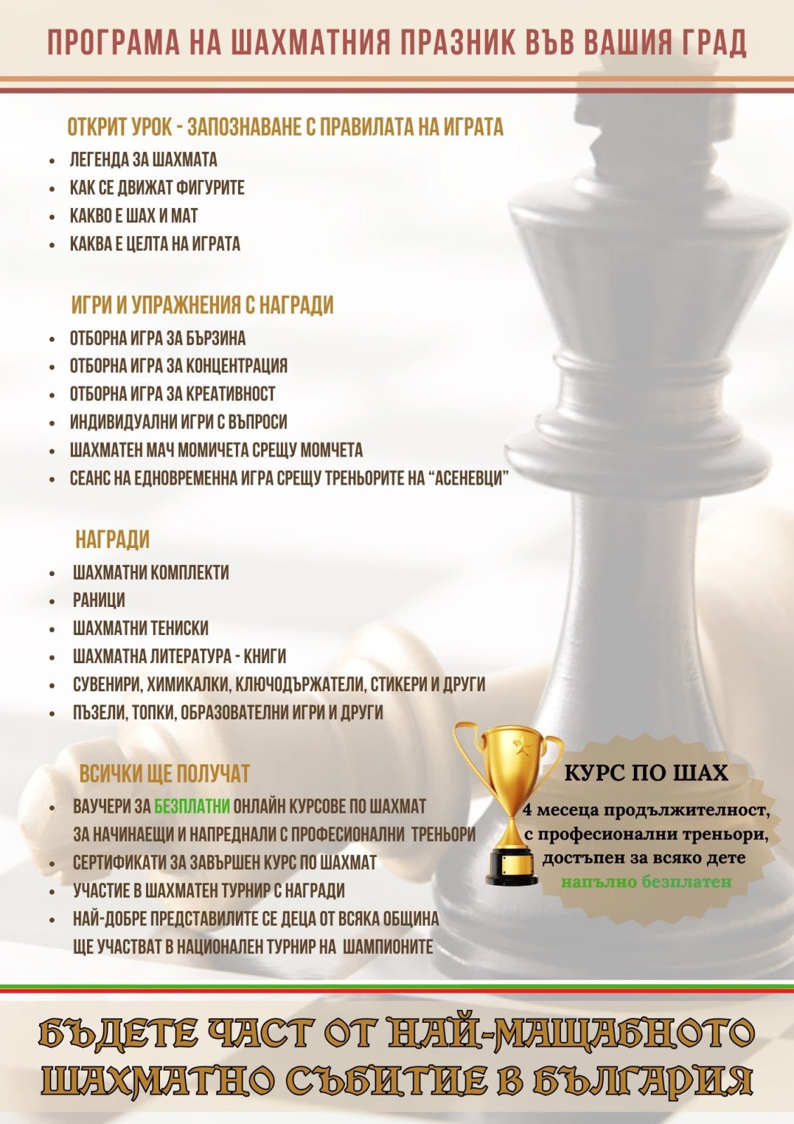 След открития урок, ще се проведат игри и упражнения, като всички участващи в тях, ще получат награди, както и ваучери за безплатен едномесечен онлайн курс по шахмат, под ръководството на професионални треньори.
