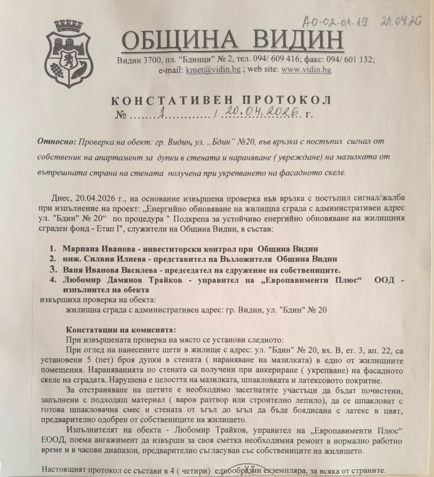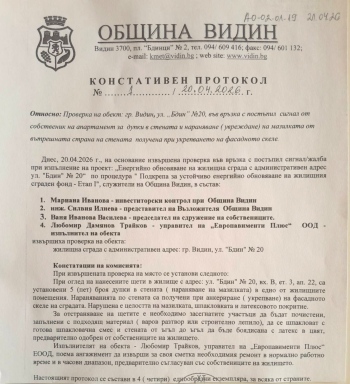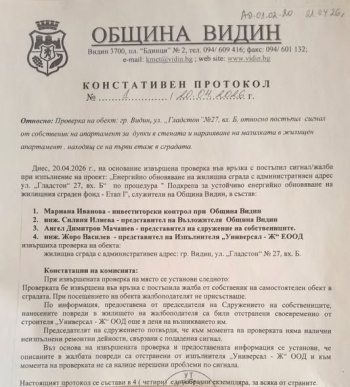 За резултатите от проверката е съставен констативен протокол с участието на управителя на строителната фирма, председателя на сдружението на собствениците, представител на инвеститорския контрол и представител на Община Видин.