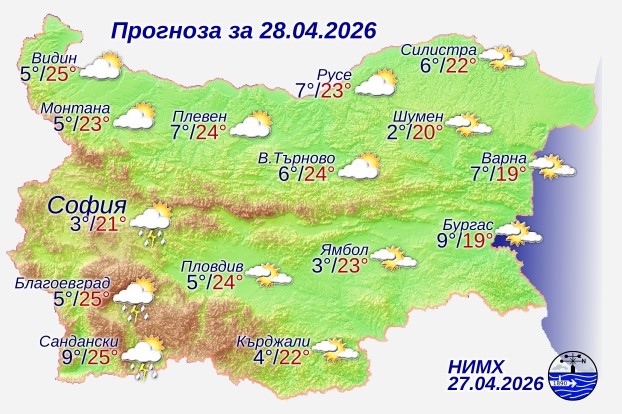 Минималните температури ще бъдат между 2° и 7°, в София - около 3°. На отделни места в североизточните райони и в котловините на Югозападна България ще има условия за образуване на слана. Днес ще е предимно слънчево. След обяд над югозападната част от страната ще се развива купесто-дъждовна облачност и на места главно в планинските райони ще има краткотрайни валежи от дъжд с гръмотевици. Ще духа слаб северен вятър, в Източна България от изток-югоизток. Максималните температури ще бъдат между 20° и 25°, в София - около 21°.