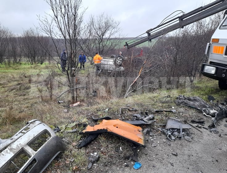От силния удар единият автомобил е излетял от пътното платно и е по таван в полето.