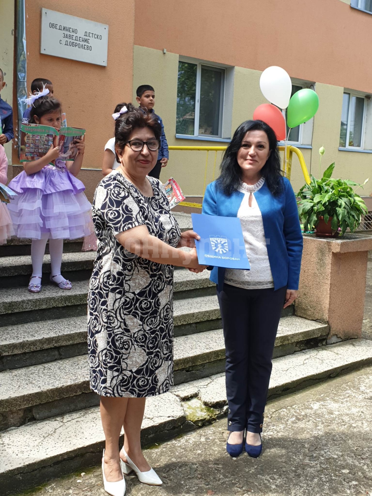 Тази сутрин Кмета на Община Борован инж. Десислава Тодорова и Зам. кмета Илияна Донкова присъстваха на тържественото изпращане на децата от IV възрастова група от детската градина в с. Добролево в първи клас. Гости на тържеството бяха и директорите от учебните заведения на територията на Общината, родители и жители на селото. Бъдещите първокласници показаха на присъстващите, че за четиригодишното обучение в детската градина са научили много игри, песни, познават буквите и цифрите и са готови за училище. Г-жа Тодорова пожела на завършващите палавници щастливо лято – пълно с игри, успешно начало в училище наесен и никога да не забравят две много важни думи – доброта и човещина. "Мили дечица, неусетно се изнизаха дните, прекарани в детската градина. Запазете в сърцата си всички хубави спомени и радостни мигове. Помнете, че истинските неща се виждат със сърцето, а не с очите. Във вашите стихотворения няколко пъти споменахте думите доброта и човещина – нека бъдем добри и човечни! Скъпи учители и родители, помагайте на децата си и бъдете винаги до тях. Честито завършване на детската градина! Успешен старт в първи клас!". След това Кмета Тодорова подари на децата книжки с български народни приказки с обещанието пак да се срещнат през септември и да й разкажат новата приказка.