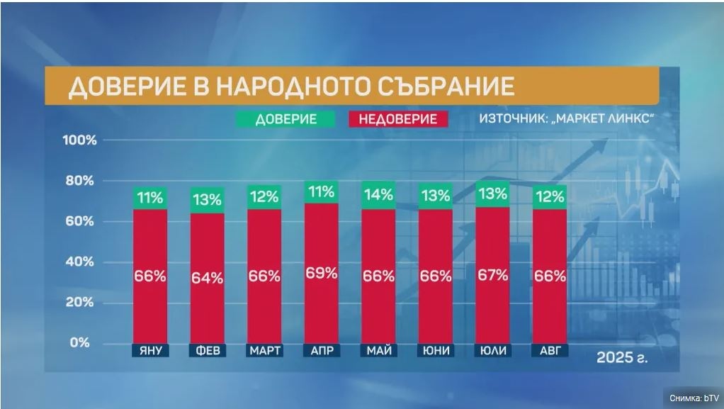 „Традиционно, парламентът е с най-ниско доверие от българските институции, заедно с българската правораздавателна система и в частност прокуратурата. Тук, все пак, не сме свидетели на тези 7 – 9%, при които приключи 50-ото Народно събрание, така че мисля, че можем да кажем, че сме в една много силно негативна, но все пак устойчива ситуация с доверието в парламента“, каза Добромир Живков.