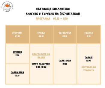 Програмата за периода 07.10 – 11.10 включва спирки в Буковец и Слана бара, кварталите на Видин – Парк „Толбухин“, Сланотрън и участие във Фестивала на трънката в с. Салаш.