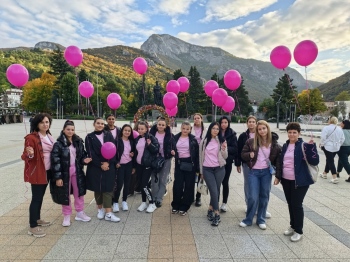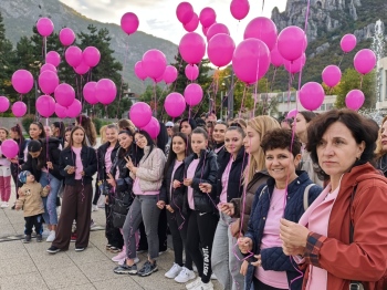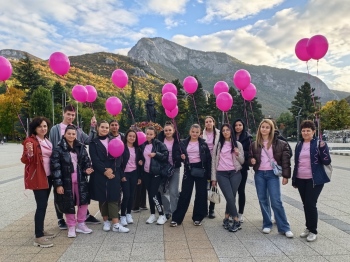 Облечени в розови тениски, гимназистите пуснаха в небето розови балони като символ на своята съпричастност към заболелите и като послание за редовна профилактика, която е отговорно поведение и спасява човешки живот.