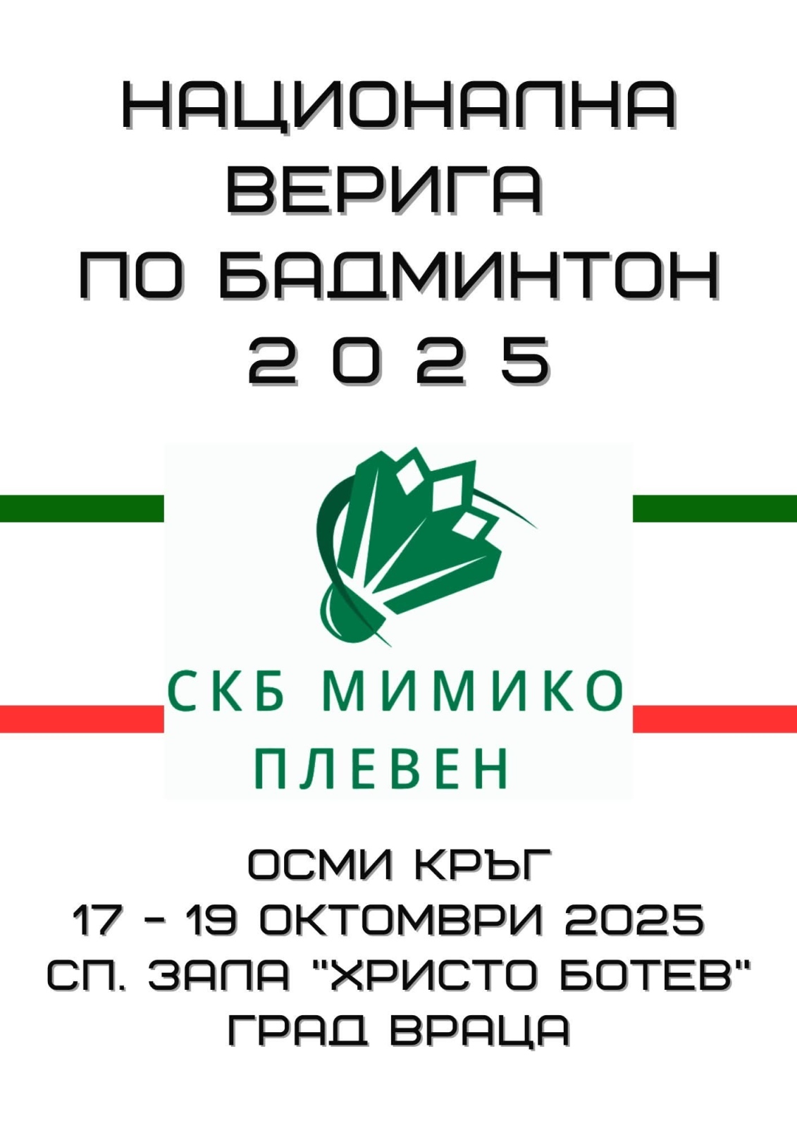 В спортната зала на СУ „Христо Ботев“ – Враца, в периода 17 – 19 октомври, се провежда осмият кръг от Националната верига по бадминтон.