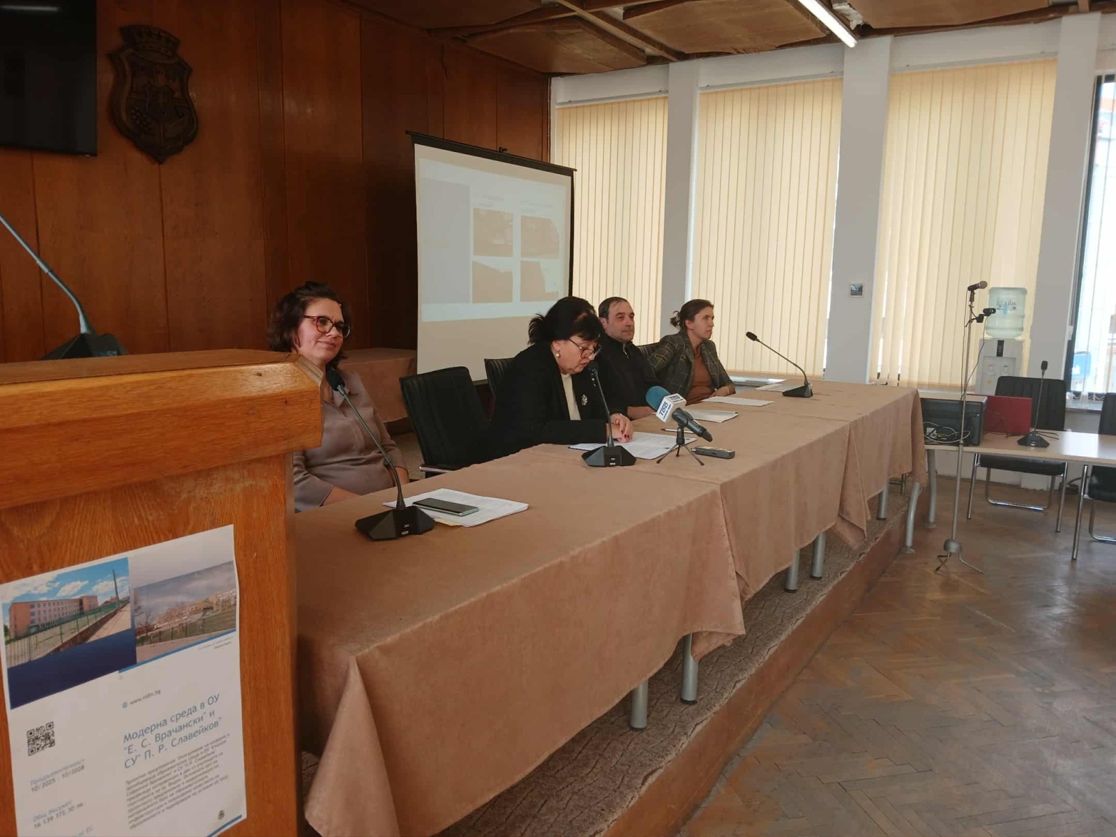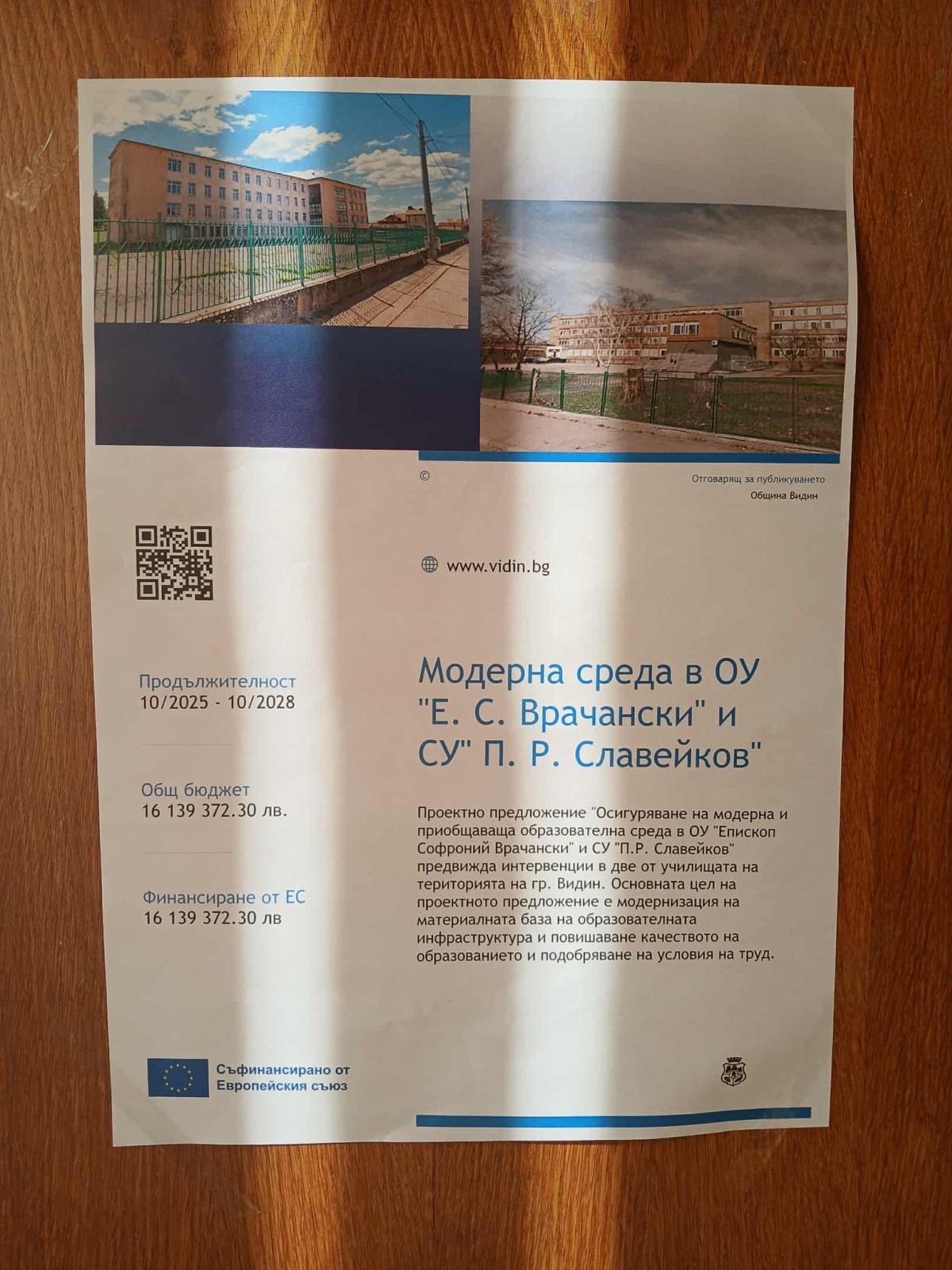 На пресконференция в залата на Общинския съвет във Видин заместник-кметът по хуманитарни дейности и социална политика Борислава Борисова представи проект „Осигуряване на модерна и приобщаваща образователна среда в ОУ „Епископ Софроний Врачански“ и СУ „П. Р. Славейков“ на стойност 16 139 372, 30 лв. Срокът му на изпълнение е 36 месеца, като началото е на 15.10.2025 г., а края – на 15.10.2028 г.