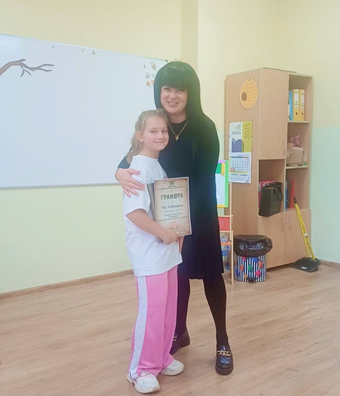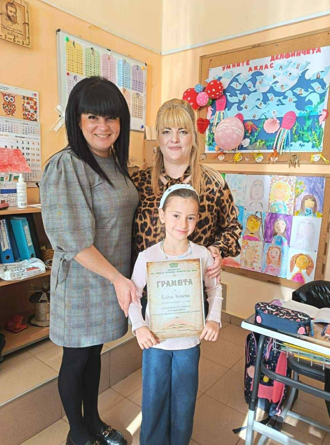 Библиотекарите Дона и Рали посетиха отличените деца в училище, за да ги поздравят, да им връчат грамоти и любими заглавия за четене извън задължителния списък. Те отправиха вдъхновяващи послания във всеки посетен клас, а гордо изправеният пред всички читател бе пример за наш малък будител.