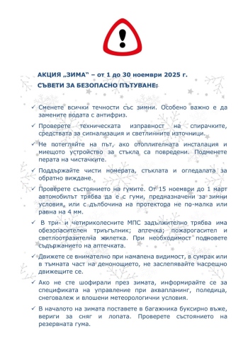 Кампания „Безопасно шофиране през зимата“ – за времето от 21 до 30 ноември, при която дейността ще бъде насочена към контрол над техническата изправност на автомобилите и на осветителните системи;
