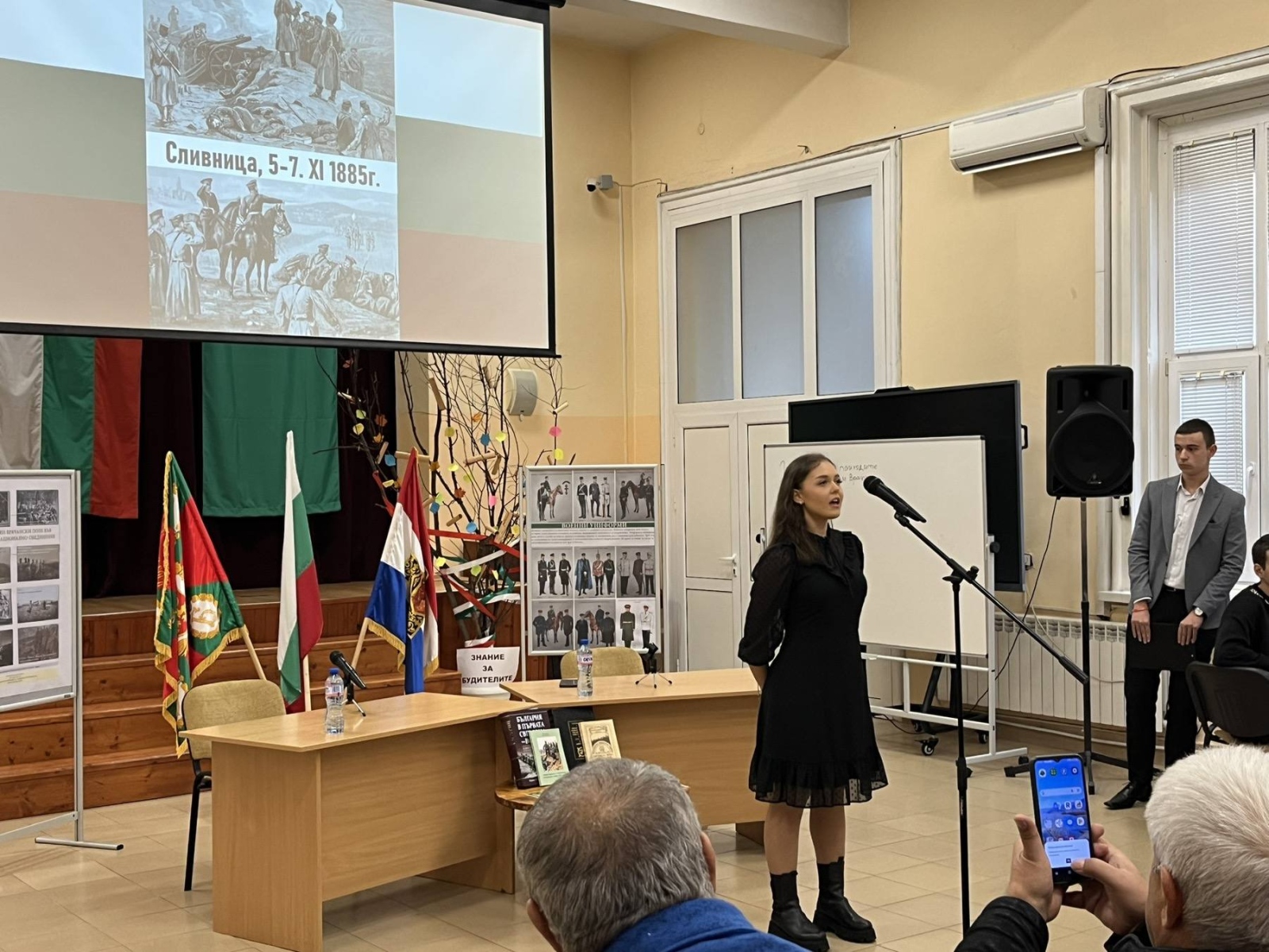 от 12 А клас, а първият лектор беше о.р. подп. Цветомир Цеков. Гости на събитието бяха командирът на военно формигование 54990 подп. Симеон Гаджев, Мая Антова - уредник в Регионалния исторически музей, Томас Петров - общински съветник, общественици и ученици. Дарина Рошкова от 10 Б клас декламира Вазовото стихотворение "Новото гробище на Сливница". Присъстващите почетоха паметта на офицера и писател подп. Иван Джунов.