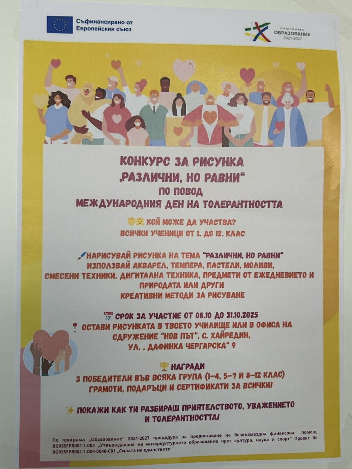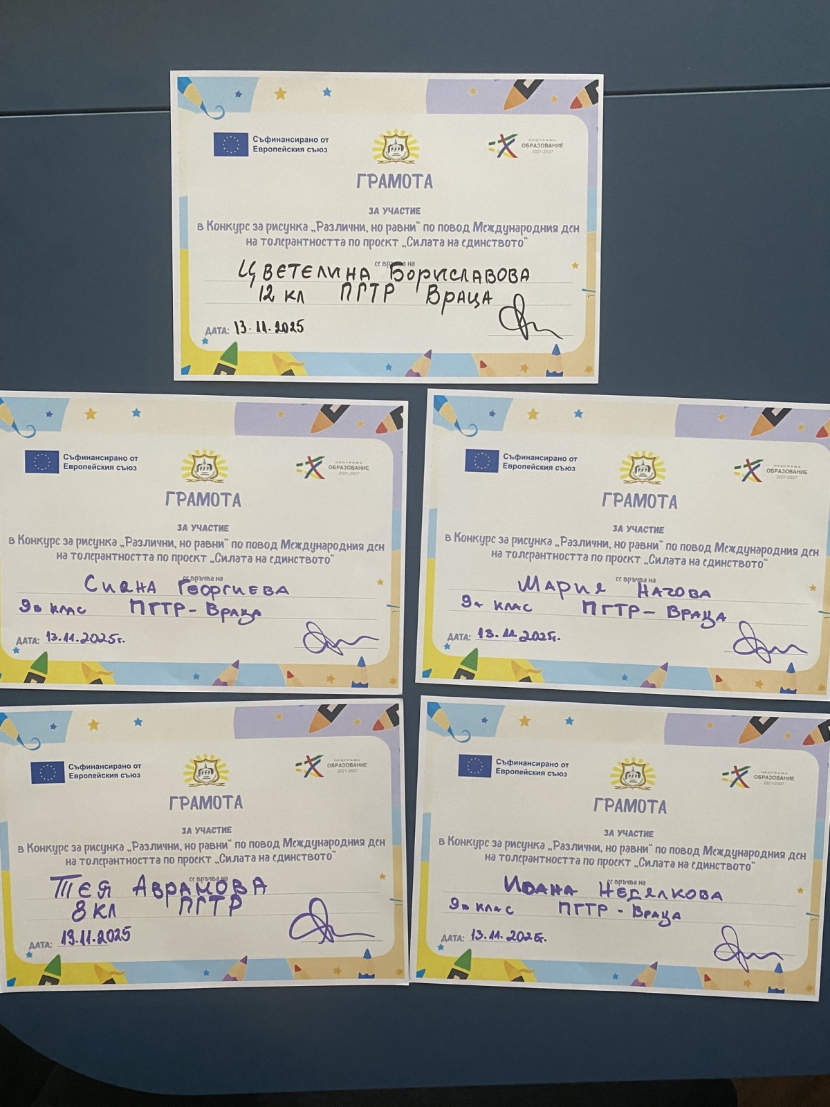 Ученичка от Професионална гимназия по търговия и ресторантьорство – Враца спечели първо място в конкурс за рисунка, организиран от Община Хайредин и сдружение „Нов Път“. Конкурсът се организира в изпълнение на Дейност 4 Провеждане на информационни кампании, насочени към недопускане на дискриминация, основана на раса, етнически произход или религиозна принадлежност по Проект № BG05SFPR001-1.004-0048-C01 „Силата на единството“, финансиран от програма „Образование“ 2021-2027. Участници в конкурса бяха СУ „Васил Воденичарски“ – Хайредин, Професионална гимназия по търговия и ресторантьорство – гр. Враца и ОУ „Горан Червеняшки“ – с. Михайлово, а целта му е да насърчи децата и младежите да изразят чрез изкуство своето виждане за толерантността, уважението към различията и равенството между хората. Инициативата е посветена на отбелязването на Международния ден на толерантността – 16 ноември, който се провежда ежегодно и е свързан с насърчаването на уважение, приемане и разбиране между хората, независимо от техните култури, вярвания или лични особености. Паола Ангелова спечели първо място, а Николай Евгениев – трето. И двамата ученици са от IXв клас на ПГТР – Враца и участваха в III група на конкурса: VIII – XII клас. Почетни грамоти за участие получиха Цветелина Бориславова от XIIв клас, Мария Начова от IХа клас, Сиана Георгиева и Ивана Недялкова от IХв и Тея Аврамова от VIIIа клас.