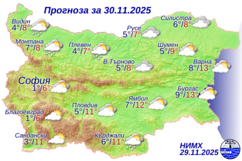 През нощта облачността ще е значителна. Главно в западната и централната част на Дунавската равнина все още ще има превалявания от дъжд, като в Западна Стара планина и по високите полета на Западна България дъждът ще се примесва със сняг, но до сутринта в повечето райони валежите ще спрат. Вятърът ще е от запад-северозапад, слаб. Минималните температури ще са предимно между 1° и 6°, в котловините на Западна България до минус 2°, а в София – около 1°. Утре облачността над западната половина от страната ще остане значителна с превалявания в планинските райони, като там над 1000-1300 метра надморска височина дъждът ще преминава в сняг. Над останалите райони ще се разкъсва и намалява. Ще духа слаб, в Дунавската равнина – умерен вятър от запад-северозапад и с него ще прониква по-студен въздух. Максималните температури ще са предимно между 5° и 10°, в София – около 6°.