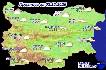 Днес над страната ще има разкъсана средна и висока облачност. Преди обяд на места в низините и около водните басейни ще има мъгла. Ще е почти тихо, в източните райони със слаб вятър от изток-югоизток. Максималните температури ще бъдат между 7° и 12°, в София – около 8°.