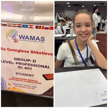 От училището с гордост съобщиха, че седмокласничката Ния Георгиева Шкетиева от ППМГ „Акад. Иван Ценов“ - Враца, постигна забележителен успех на Световното първенство по ментална аритметика WAMAS 2025. Състезанието се проведе в края на месец ноември в Дубай, Обединени Арабски Емирства. Представяйки България и Smarty Kids – Враца, Ния победи стотици участници от множество държави и спечели престижната титла СУПЕРШАМПИОН WAMAS 2025.