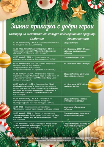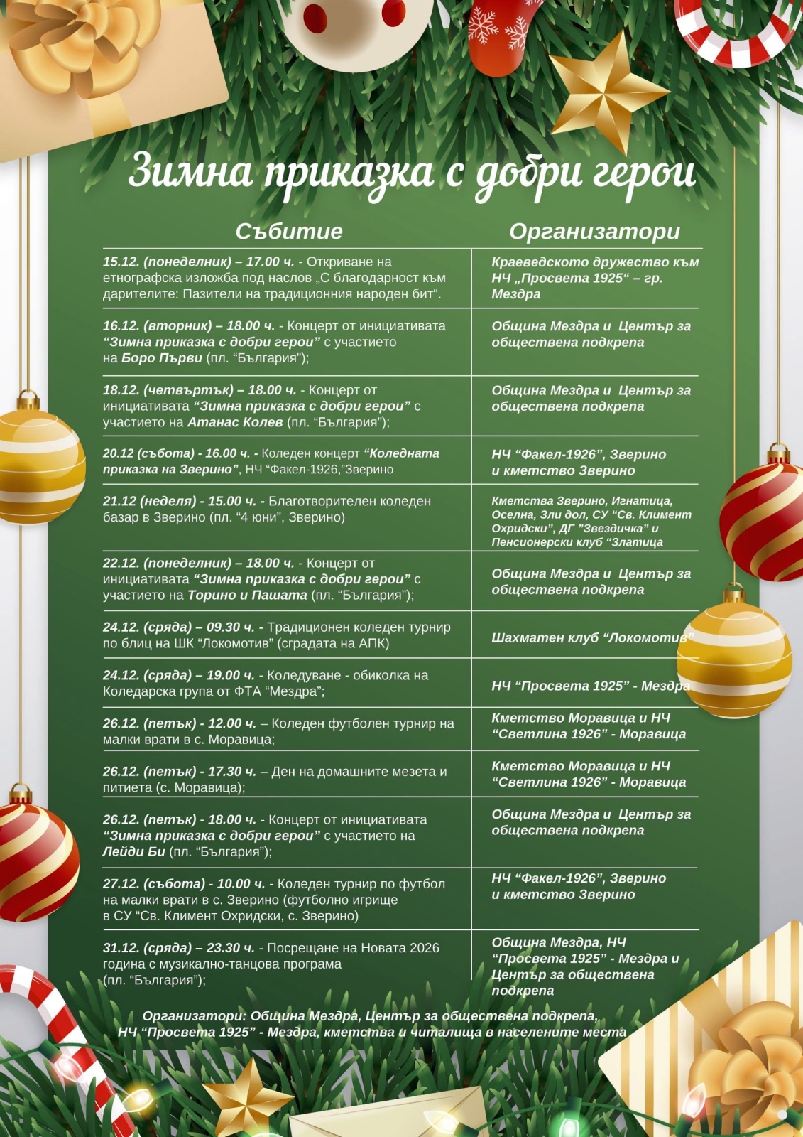 Календар на събитията от коледно-новогодишните празници можете да видите тук: https://konkurent.bg/pic/posts/2025-12/17647560481715/embed/files/Obshtina%20Mezdra_Koledno-novogodishni%20praznitsi%202025_Programa.pdf