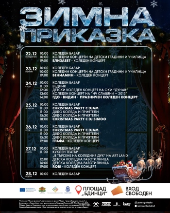 Старопрестолен Видин ще посрещне един от най-големите християнски празници Коледа с много активности за малки и големи, интересни забавления и културни прояви. Разнообразна коледна програма очаква всички жители и гости на града на фестивал „Зимна приказка“. Организираното от Община Видин и Event Masters събитие започва на 22 декември и продължава без прекъсване до 28 декември.