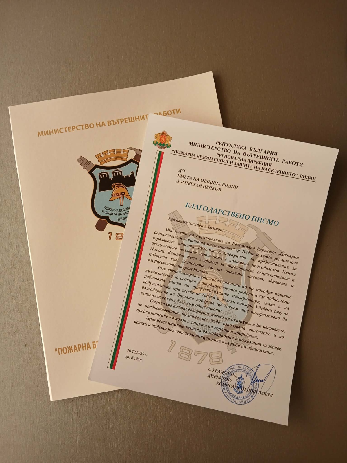 Община Видин връчи автомобил „Нисан Навара“ на Регионалната служба „Пожарна безопасност и защита на населението“. Ключовете бяха предадени от секретаря на общината Емилиян Енчев на директора на РДПБЗН комисар Стилиян Пешев. Автомобилът е с висока проходимост и е оборудван с 300-литров резервоар за вода. Той е закупен за нуждите на доброволното формирование, което се състои от 19 човека, и гасаческата група, която наброява 7 човека, и е предназначен за борба с горските пожари в труднодостъпни пресечени местности.