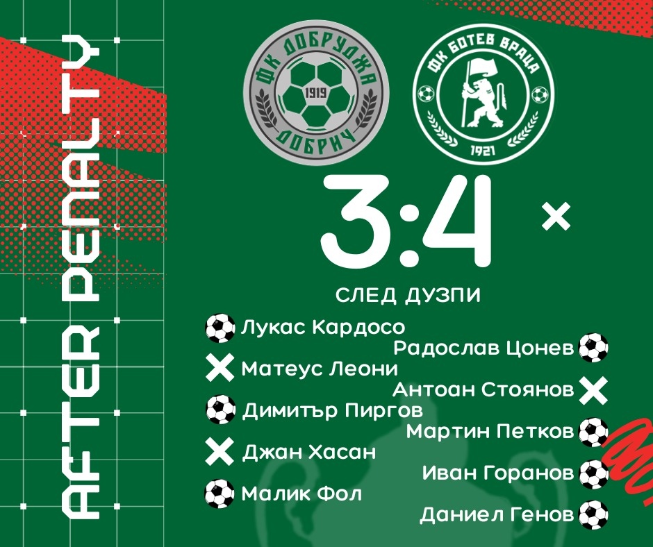 Отборът на Ботев Враца се класира за 1/4-финалите в турнира за Купата на България. Съставът воден от Тодор Симов надделя като гост над Добруджа с 4:3 след изпълнения на дузпи. В редовното време и продълженията срещата на стадион "Дружба приключи без отбелязани голове. Домакините завършиха с човек по-малко, след като в 40-ата минута вратарят Георги Аргилашки бе изгонен от игра. С основна заслуга за успеха на гостите бе вратарят Димитър Евтимов, който се появи в игра малко преди изпълненията на 11-метровите наказателни удари да започнат, на мястото на игралия като титуляр в днешната среща Любомир Василев.