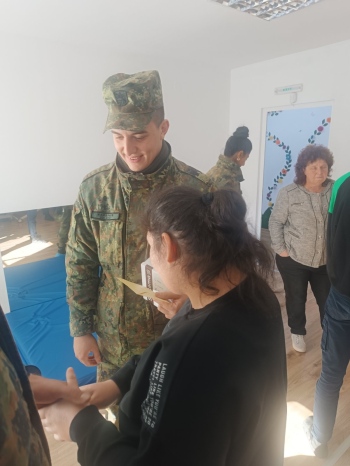 Управителят на центъра Ива Станчева посрещна военнослужещите и ги запозна с дейността на институцията. Те имаха възможност да разгледат Сензорната стая, Рехабилитационната стая и стаята за групови занимания, където ежедневно се полагат грижи за децата и пълнолетните лица с увреждания.