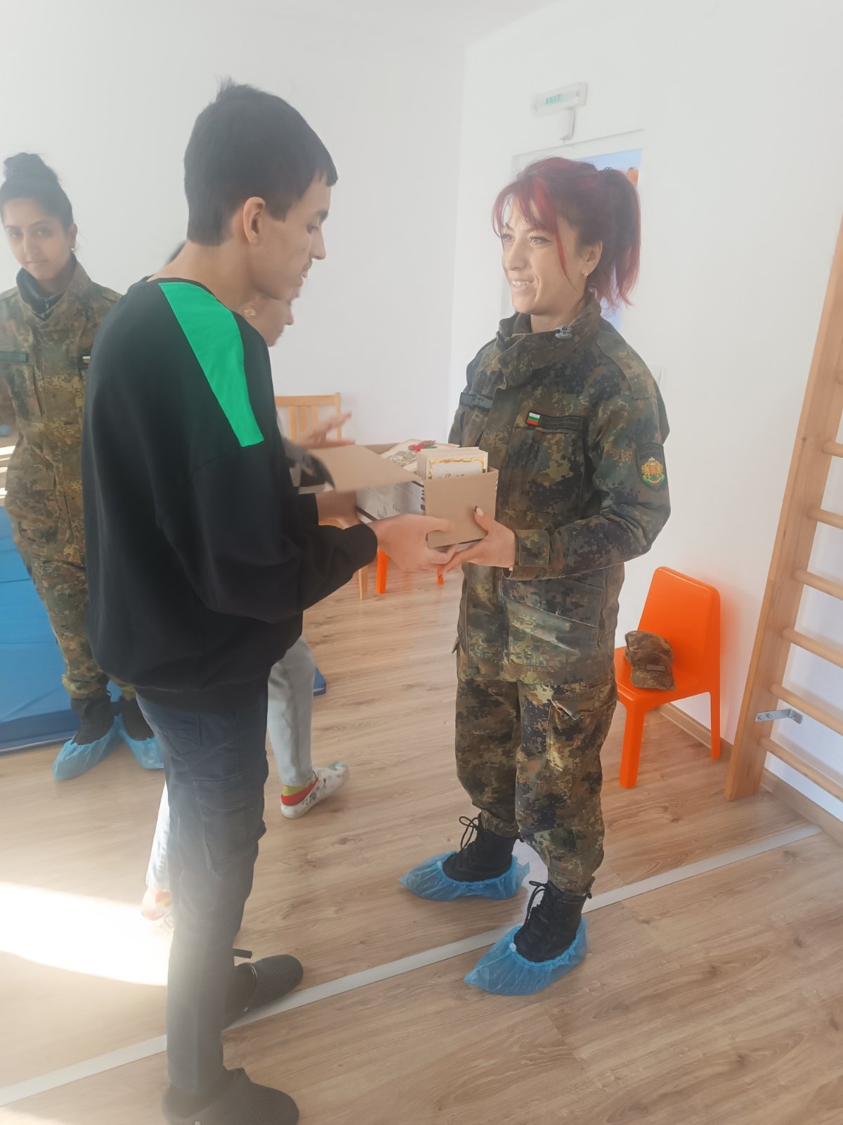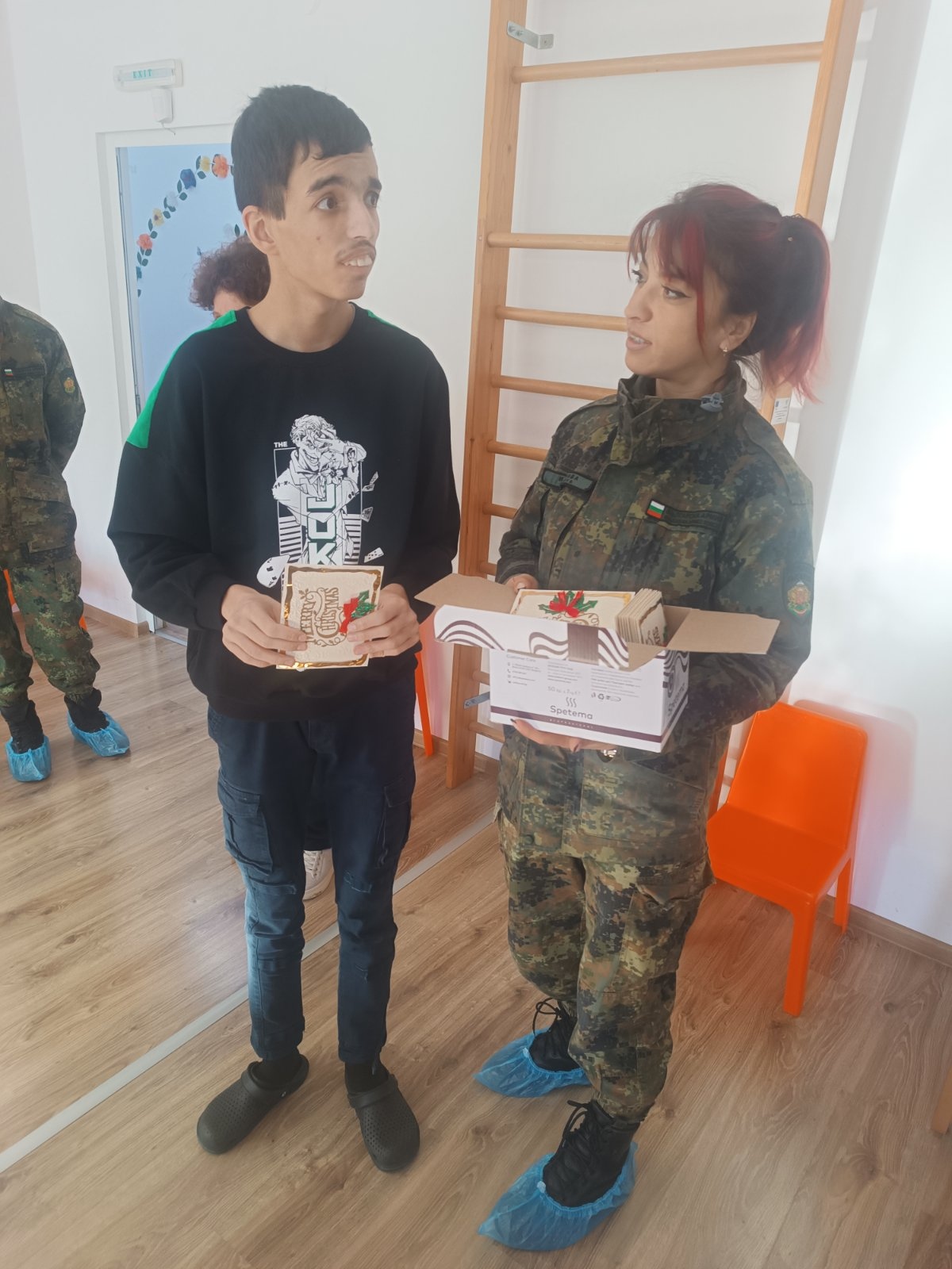 В знак на признателност и благодарност за оказаната подкрепа, потребителите и екипът на Центъра поднесоха на военнослужещите ръчно изработена коледна картичка – символ на топлото отношение и взаимната подкрепа.