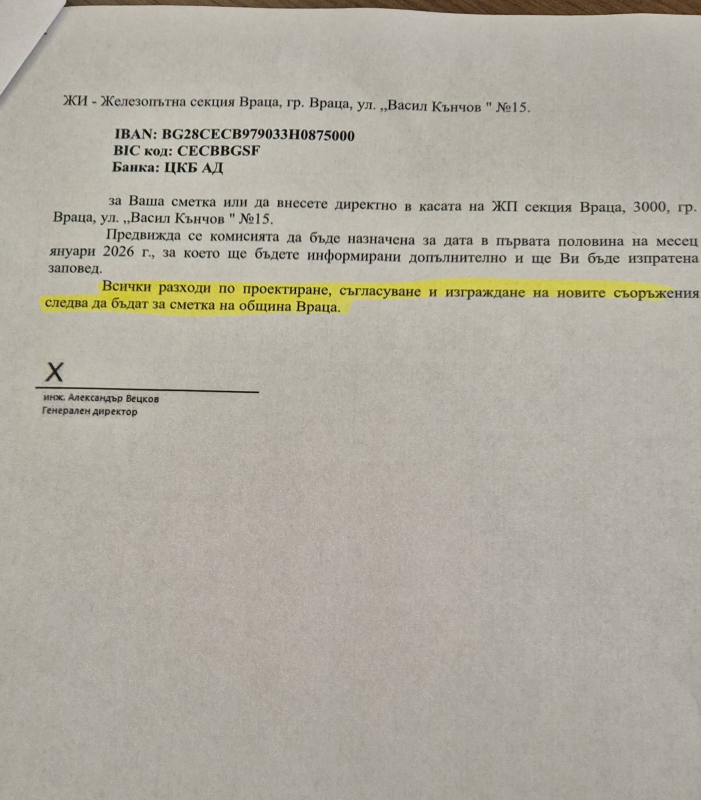 "Необходимостта от нови съоръжения за пресичане на железопътната инфраструктура се преценява от комисия по чл. 46 на Наредба 4 за железопътните прелези. Тя се съставя от представители на ДПНКЖИ, Пътна полиция и Община Враца."