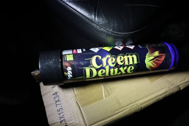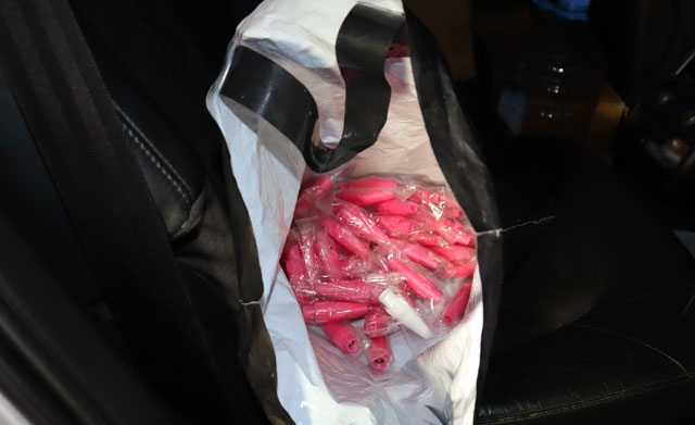 В условията на неотложност разследващи извършили претърсване в колата. Там открили и иззели 10 кашона с общо 57 флакона по 666 грама диазотен оксид (райски газ) и найлонов плик с 63 пластмасови накрайници.