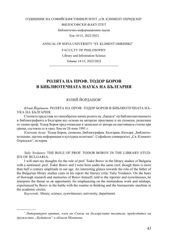 „Моите размисли за ролята на проф. Тодор Боров в библиотечната наука на България ще започна с един сантимент: с проф. Тодор Боров сме родени под един и същи покрив, макар между нас да има амплитуда от над половин век във възрастта. Не се учудвайте – причината е твърде проста: на 22 юни 1928 година дядо ми купува от бащата на професора къщата, в която се е родил и изживял детските си години, а аз от години и сега продължавам да живея в нея! – каза докладчикът. - Несъмнено в историята на българската библиографска наука името на професор Тодор Боров ще остане завинаги записано със златни букви. И с пълно основание - той положи нейните основи, беше и си остава първият и единствен директор на Българския библиографски институт „Елин Пелин” от основаването му през 1941-а до закриването му през 1964 година.
