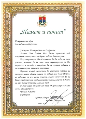 Община Лом почете с поздравителен адрес видния художник-акварелист от Лом Светлин Софрониев по повод неговия 50-годишен юбилей. Маестро Софрониев е един от най-добрите съвременни художници. Акварелите му се отличават със своя колорит и реализъм и се радват на изключителен интерес в страната и чужбина. Неговите творби намират място на страниците на специализирани световни издания и каталози.