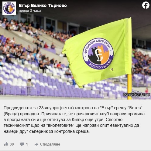 Етър официално обяви, че контролата с Ботев (Враца) е пропаднала. Двата тима трябваше да се изправят един срещу друг на 23 януари (петък), но врачани ще отпътуват за Кипър по-рано и няма да могат да изиграят проверката с “виолетовите”.
