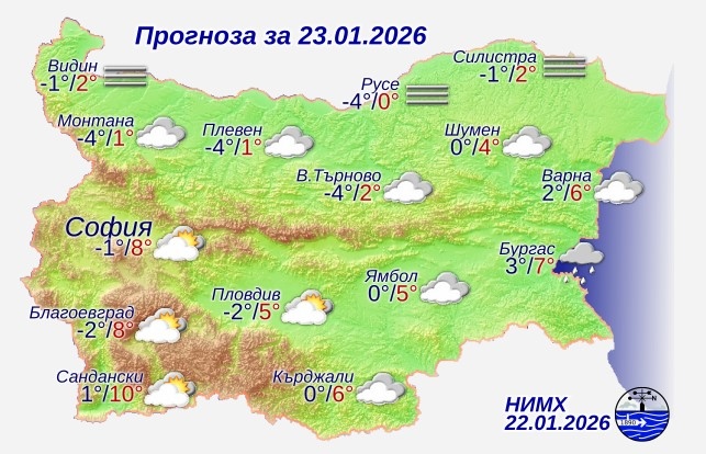 Днес преди обяд на много места в равнините и котловините ще бъде мъгливо или с ниска слоеста облачност, която след обяд ще се разсее, но над Северна и Източна България ще се задържи почти през целия ден. Слаби превалявания от дъжд ще има в крайните югоизточни райони. В планините и планинските райони ще бъде предимно слънчево. Ще бъде тихо, в Североизточна България със слаб северозападен вятър. Максималните температури ще бъдат от около нулата в районите с трайна мъгла до 8°-10° в Югозападна България, в София – около 9°.