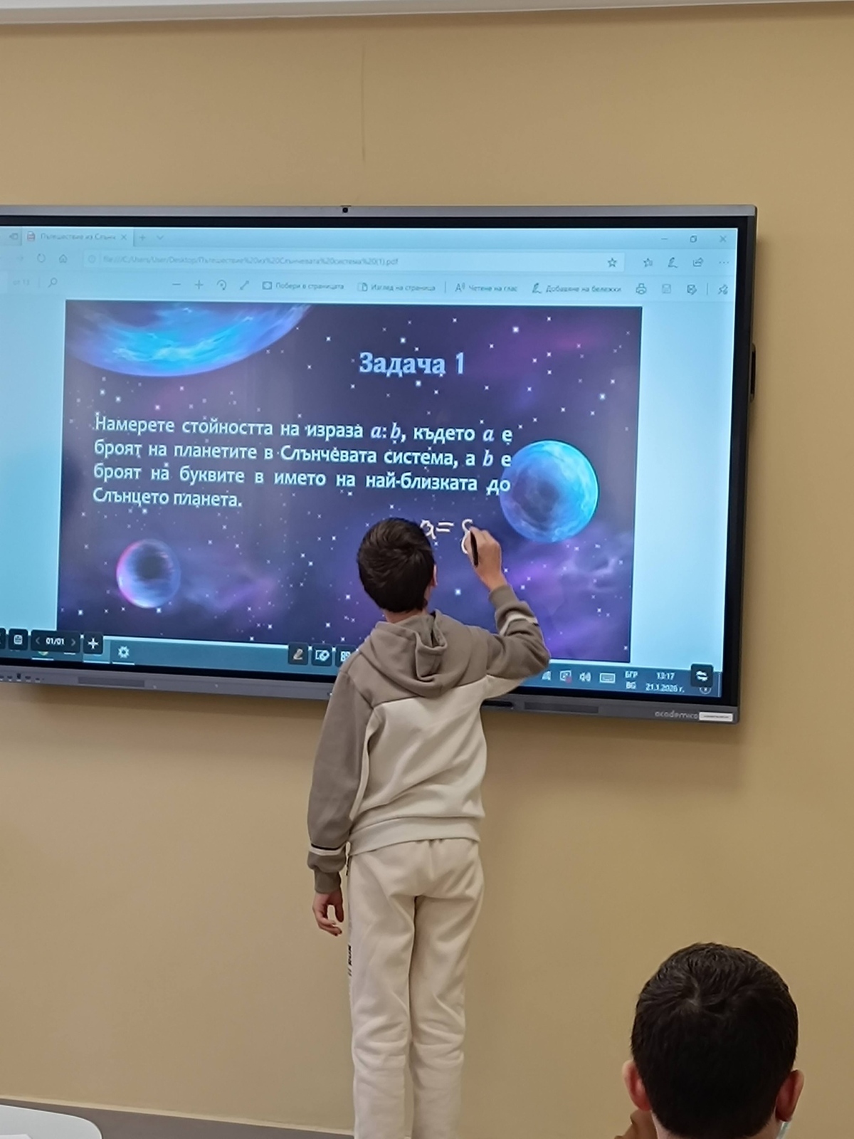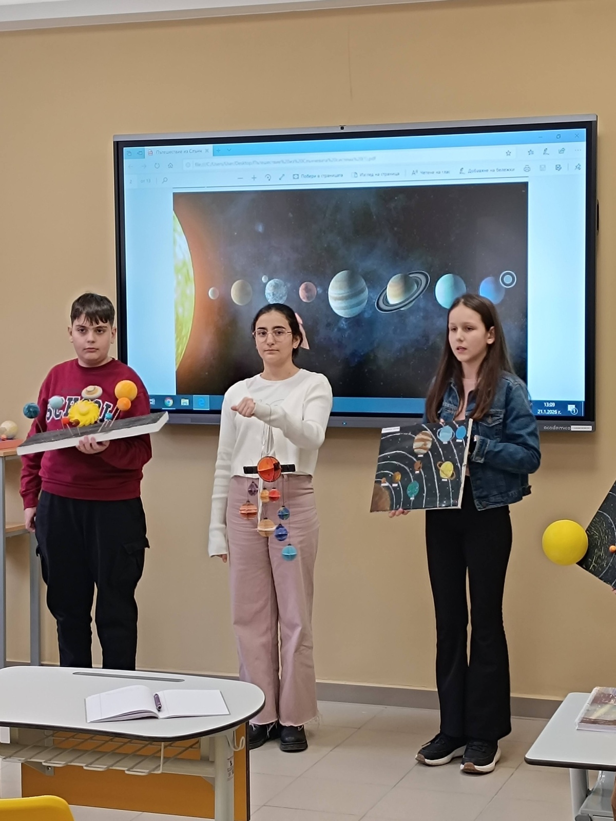 На 21 януари в СУ "Васил Кънчов" се проведе урок в 5. клас на тема Пътешествие из Слънчевата система. Целта на урока е да покаже съвременни методи на преподаване чрез осъществяване на междупредметни връзки по математика и природни науки.