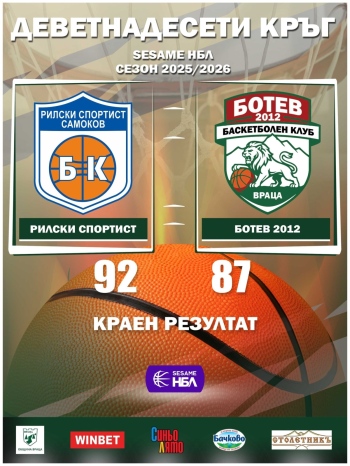 Рилски спортист записа пета поредна победа в Sesame НБЛ, след като постигна труден домакински успех срещу Ботев Враца с 92:87 (22:24, 28:19, 16:26, 26:18) в двубой от 19-ия кръг.